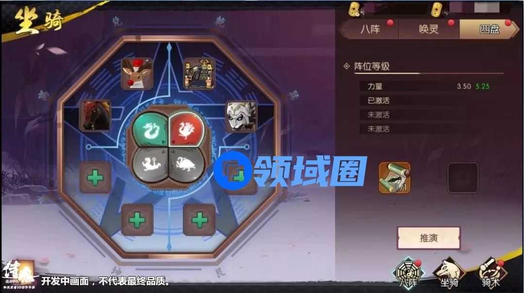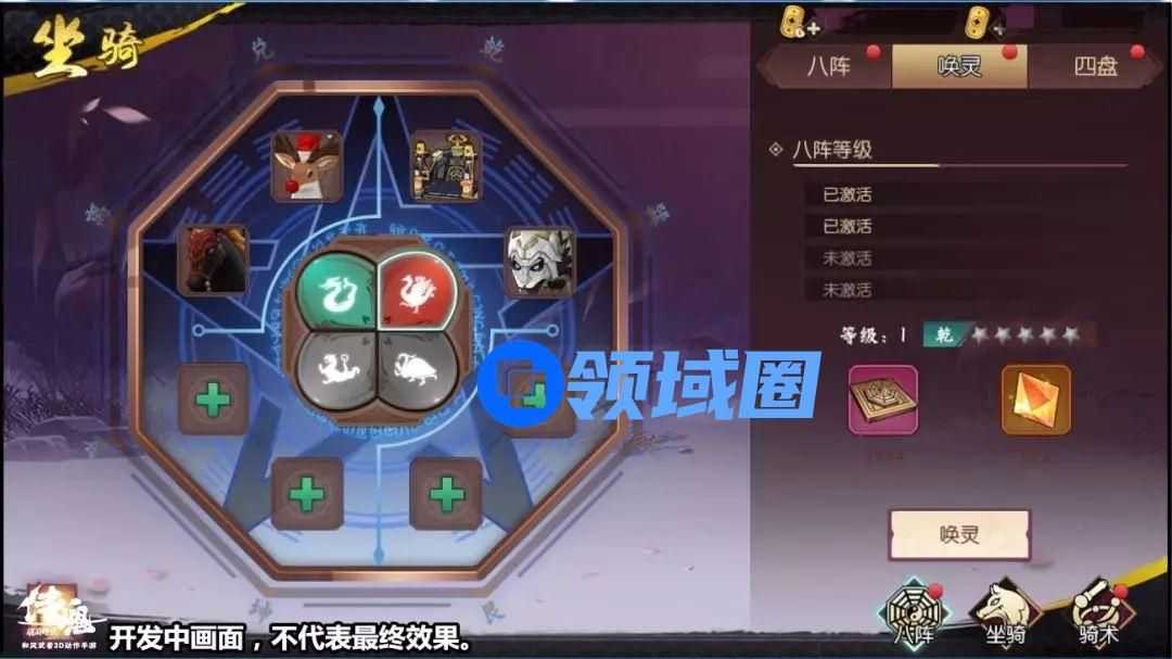 【八阵】系统,可由【坐骑】界面进入,共分为【八阵】、【唤灵】、【四盘】三部分: