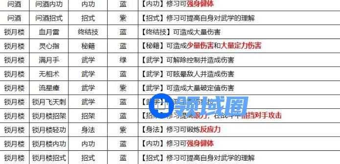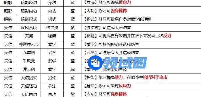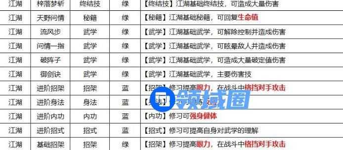 被动技能为招架()、身法()、内功()、招式()。同品质的情况下,个人推测各门派被动技能在数值上可能会有差别。