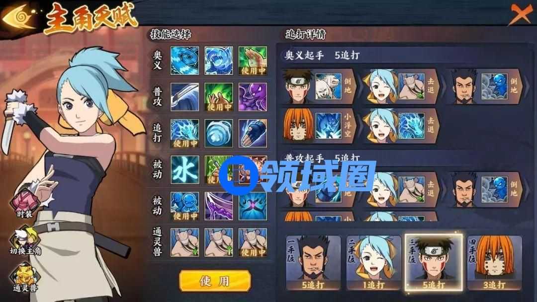 这支阵容拥有非常强的作战能力。水主、牙【疾风传】以及佩恩【畜生道】通灵兽,均能享受到畜生道被动“增幅通灵”加持,往往一回合集火能够将对方一人打残甚至直接带走。这套阵容中,水主奥义和普攻都选择回复加血,被动选择医疗心得是为了能够增加回复量。被动“水遁·水分身之术”可以让分身二动来为小队加血。