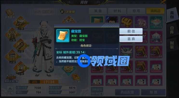 藏宝图属于消耗品,可以再背包中的消耗品栏找到,点击藏宝图即可进行自动寻路挖宝,挖宝成功后会直接获取各种道具奖励,其中包括宝石、消耗品、限时时装等等。藏宝图使用后会消失。