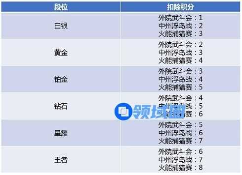 7)青铜段位战场失利不进行扣分,其余段位扣分详情如下: