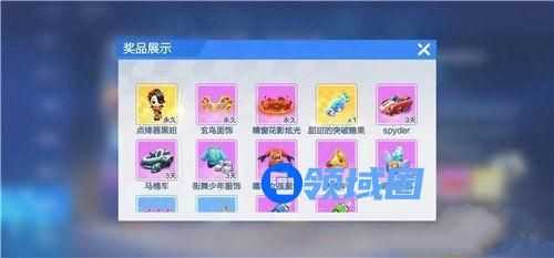 永久玄鸟面饰、永久晴窗花影炫光、甜甜的突破糖果*1、spyder*3天、马桶车*3天、街舞少年服饰*3天、嘻哈女孩服饰*3天、大喇叭*1、萌宠奶瓶*2、666*5、香蕉*5、雯雯蓝色喷漆*1天、雯雯绿色喷漆*1天。