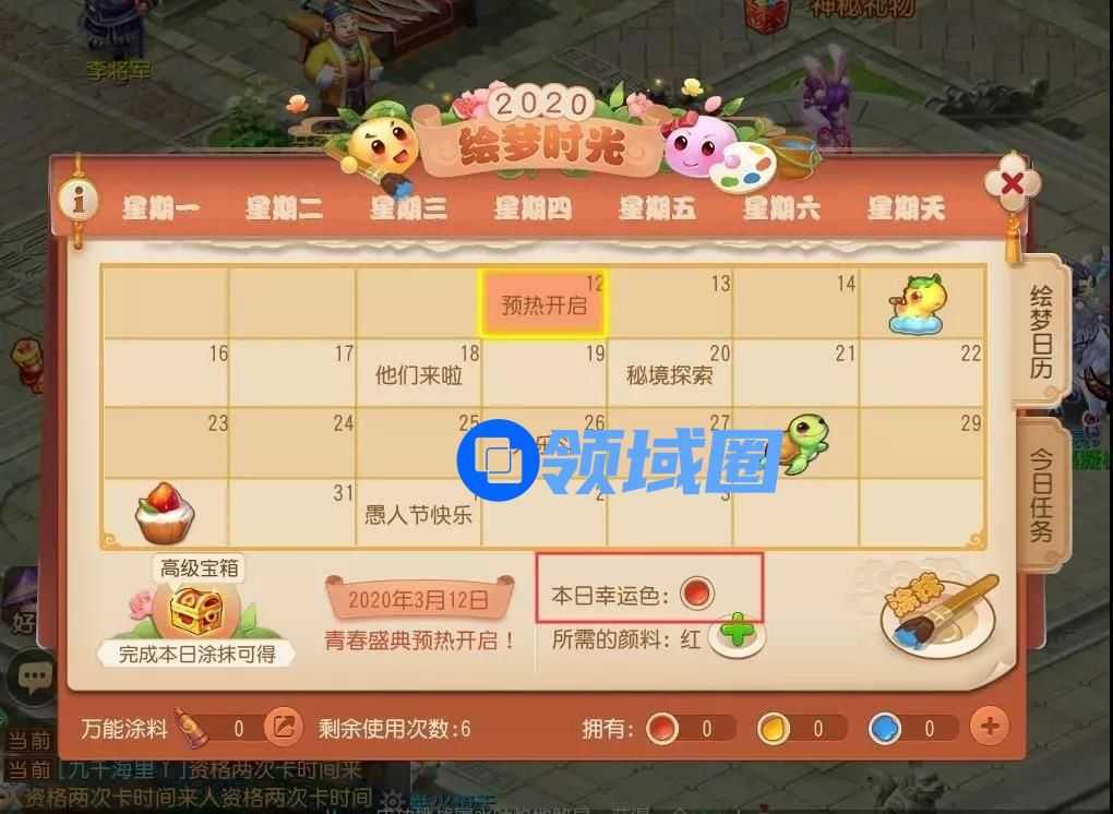 每日的绘梦日历都会有一个幸运色,今天的幸运色是红色,灵儿只要将红色的颜料涂抹上去就可以了。