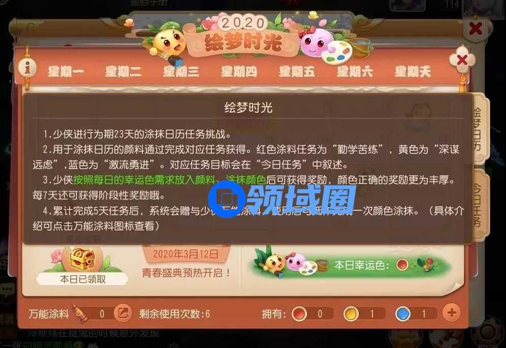宝宝们需要进行为期23天的涂抹日历任务,涂抹日历的颜色分为三种:红色、黄色和蓝色,宝宝们只需将今日的幸运色涂抹进日历即可获得奖励,每过7天还会获得阶段性奖励。累计完成5天任务后,系统还会送宝宝们一支万能涂料,用来抵作一次颜色涂抹任务。