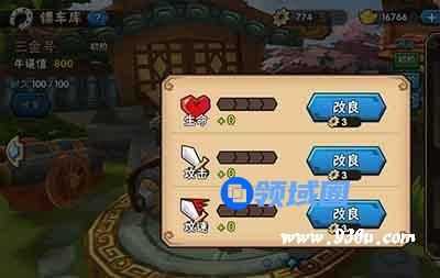 进入游戏主界面后,点击【镖车库】后,在上方即可查看现有齿轮数量。选择一辆镖车,点击【改良】图标,即可消耗一定数量齿轮来增加镖车生命值、攻击力和攻速,提升镖车战斗力,改装次数越多,单词消耗的齿轮数量也越多。