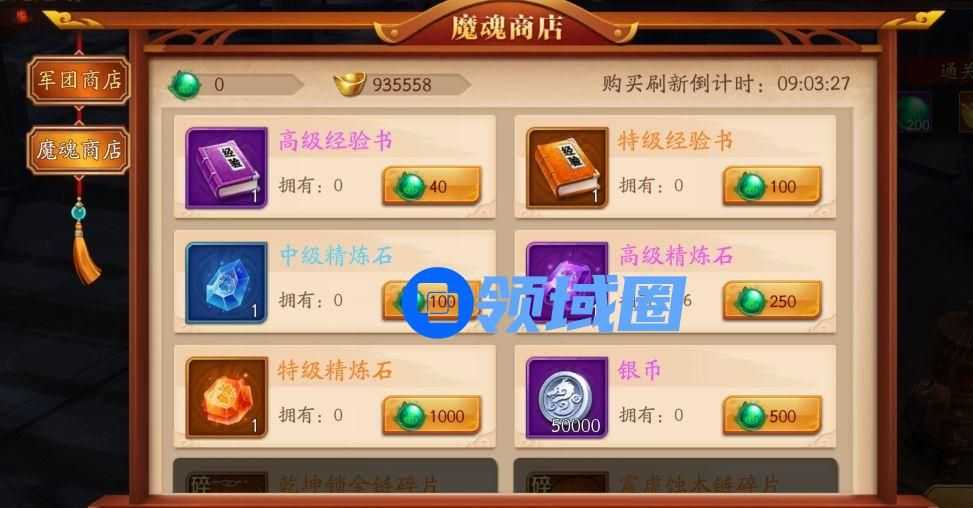 爬塔挂机产出的魔晶石可以在魔魂商店中兑换经验书、精炼石、装备等道具。