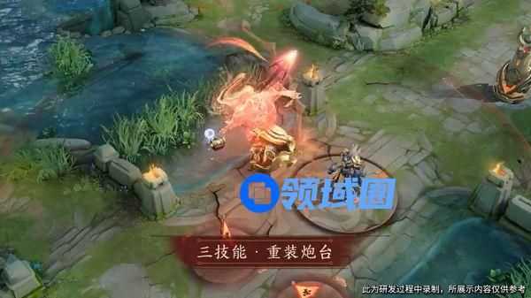 武器道具设计上,“烈魂狮头炮”配色与盔甲类似,曙色辅以金色——炮口的样式为张开巨口的金色狮子头,曙色的炮身为暗藏机关的复杂结构。