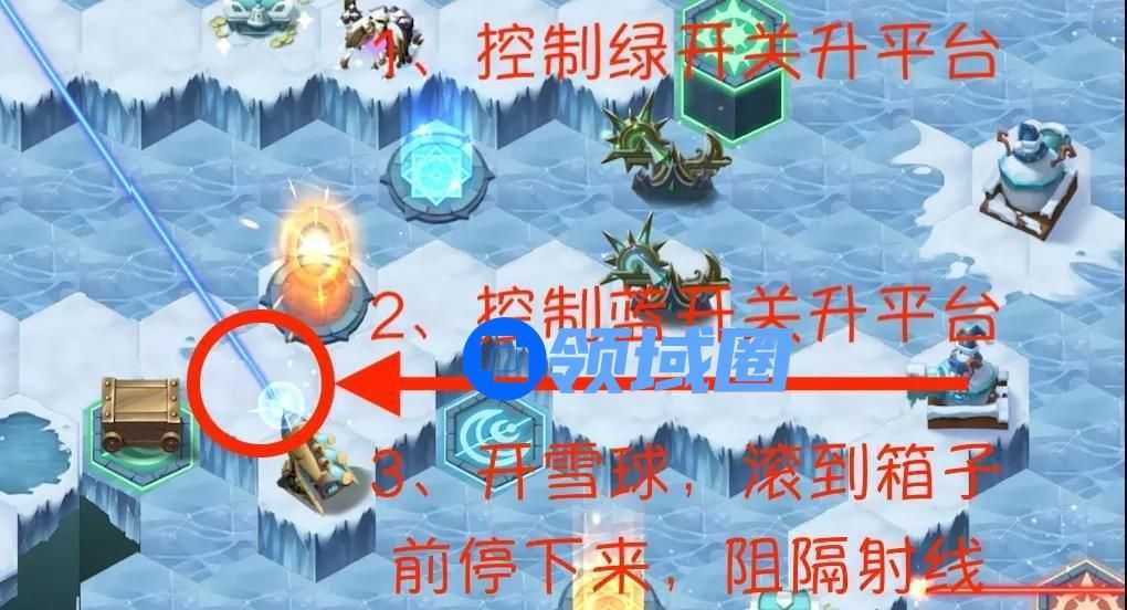 拿到宝箱之后,可以开雪球,升起蓝色平台,阻隔冰射线,那么火射线就会启动。