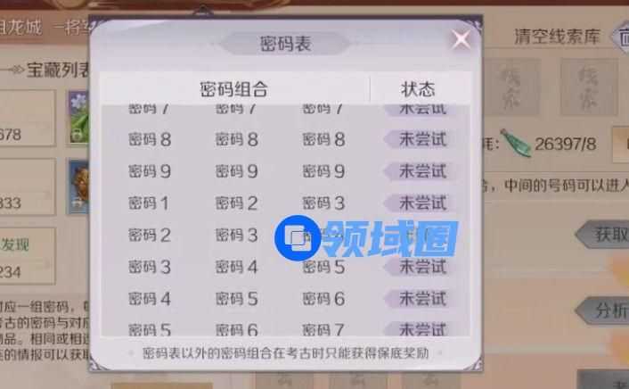 同理,三个情报号码可以组合成一个考古密码,三个考古密码组合可以获得相应的考古道具奖励~