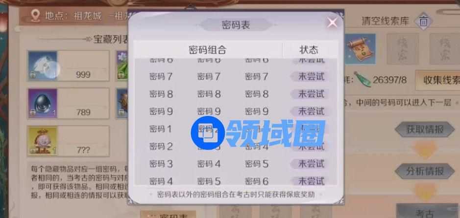 解谜游戏其实类似于数独游戏,通过单个数字为核心线索,收集其前后数字或相同数字进行密码组合。只要在“考古”的情报栏中成功将收集到的情报组合成能够对应密码表中的密码组合,就能获得奖励啦~