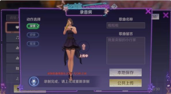再给歌曲起个名字,为你的歌曲写段留言,就能上传让其他修真者听到你的歌声了;遇到喜欢的歌曲可以收藏到我的收藏中,也可以去主界面搜索栏里找歌手或歌名;