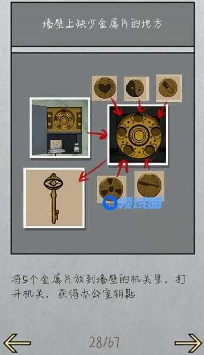 将5个金属片放到墙壁的机关里,打开机关,获得办公室钥匙