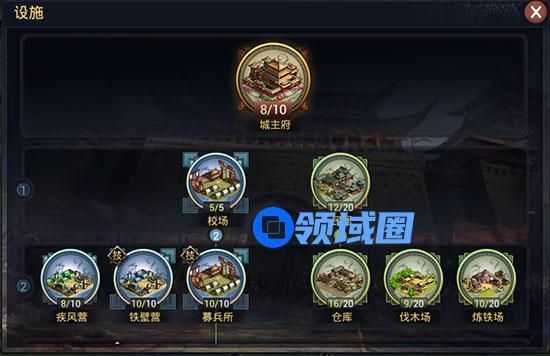 1、点击主城,并在右下角点击“设施”,就可以进入游戏的科技树系统。军事与城市建设这两大分支玩家可以根据需要着重发展其中一支,也可以并行 发展。而且科技树系统以城主府等级为核心,相关科技需要城主府达到一定等级才可以研究并升级,如提高城区耐久度的科技“城墙”需要城主府达到四级才可建造。