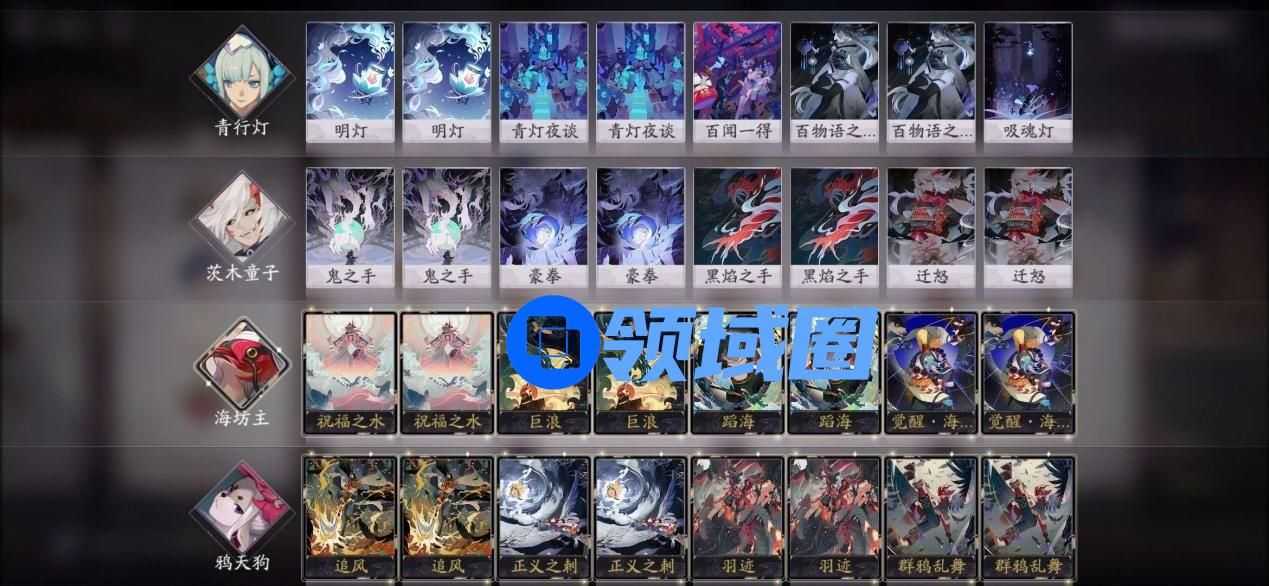 第二套卡组则是茨木童子与鸦天狗的搭档。这套卡组还携带青行灯与海坊主,让二勾玉二段之前的场面即可获得源源不断的鬼火资源。由此,茨木童子的“迁怒”、“黑焰”与“鬼之手”可以实现连击操作,配合鸦天狗的“正义之刺”也很好用。如果对方战斗区式神难以处理,玩家则可以使用鸦天狗的“羽迹”来拉出较弱式神,随后使用茨木连击,海坊主提供回复与加成效果。