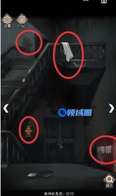 点击前面的门,安上把手,玩游戏开门(我看广告开的),捡起门下面的红色密码牌。这个场景就结束了,可以转换场景了,但它下面的收集显示差一个,这个就要你点下方的日记本并且看日记(看广告,点日记中间看广告,不是观察的广告)