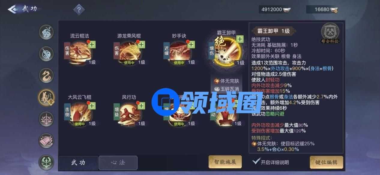 NO1:绝技,霸王卸甲。义麟的招牌核心技能,忽视闪避的范围群伤技能,附带封轻功、内外功攻击减少、受到伤害增加。特殊招式还可以使敌人迟缓,是目前游戏中的最强控制技能之一,根骨值和身法值双属性提升技能全效果,越到后期,技能等越高越强力,加点升级第一位的技能。