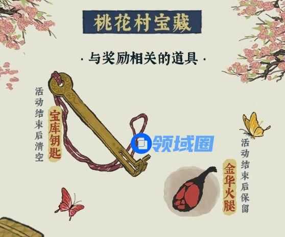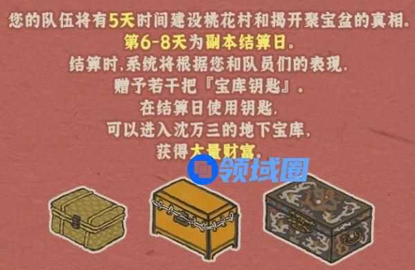 想要获得宝藏首先要参加桃花村探险活动,帮助建造桃花村才有宝藏可以收获,28日启动的桃花村探险活动时间为5天,在持续的5天时间中玩家要解开聚宝盆的秘密,活动期间内就能领取数量众多的宝库钥匙啦,桃花村系列活动结束的时候,就可以通过宝库收获沈万三隐藏在地下宝藏中的宝贝了。