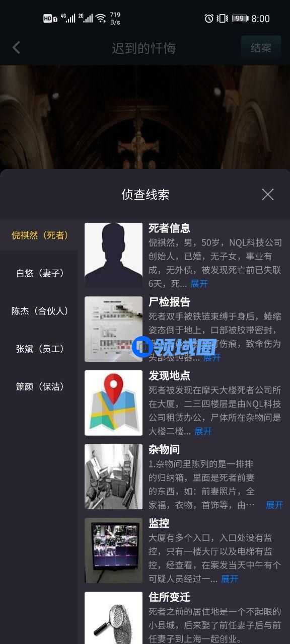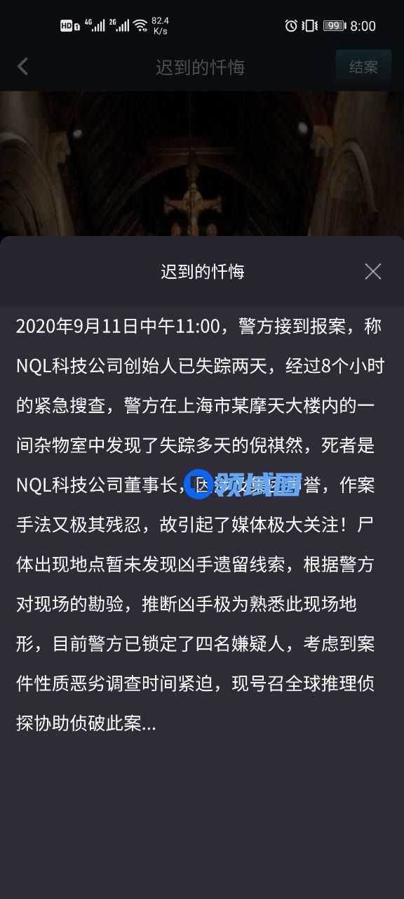 2020年9月11日中午11:00,警方接到报案,称NQL科技公司创始人已失踪两天,经过8个小时的紧急搜查,警方在上海市某摩天大楼内的一间杂物室中发现了失踪多天的倪祺然,死者是NQL科技公司董事长,因涉及集团声誉,作案手法又极其残忍,故引起了媒体极大关注!尸体出现地点暂未发现凶手遗留线索,根据警方对现场的勘验,推断凶手极为熟悉此现场地形,目前警方已锁定了四名嫌疑人,考虑到案件性质恶劣调查时间紧迫,现号召全球推理侦探协助侦破此案...