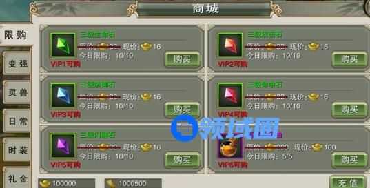 2、商城内分为元宝商城、VIP商城和礼金商城。只有VIP才能在VIP商城中购买物品。