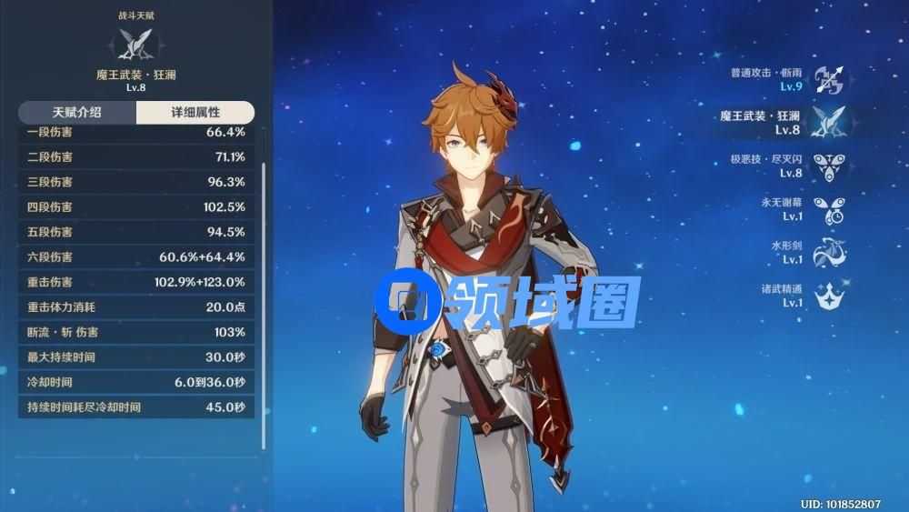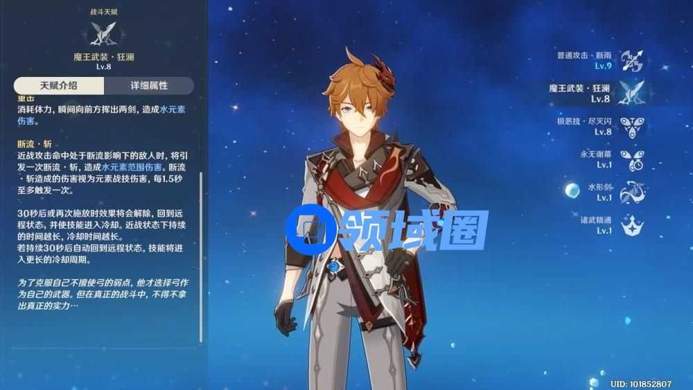 元素战技·魔王武装·狂澜:解放纯水结构的武装,对附近敌人造成水元素伤害,并进入近战状态,近战状态下的所有普攻重击皆视为水元素伤害,并且攻击处于断流效果下的敌人,将引发一次断流·斩,造成水元素范围伤害;