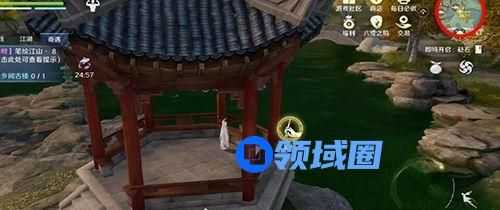 这个地方是飞雪滩边的一座小亭,旁边有桥有湖,进入其中就可以看到描绘的交互键了(实在找不到的看看右上角小地图)。