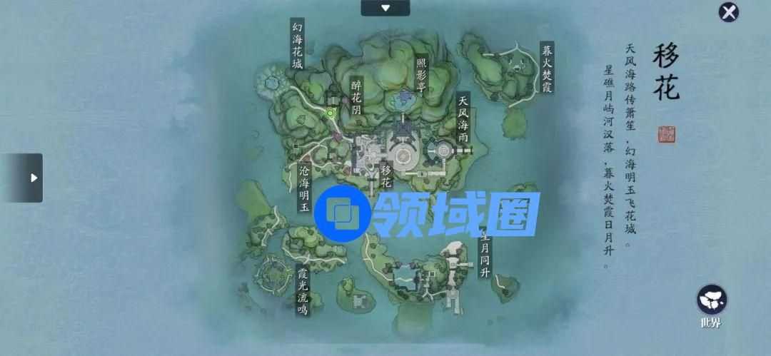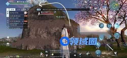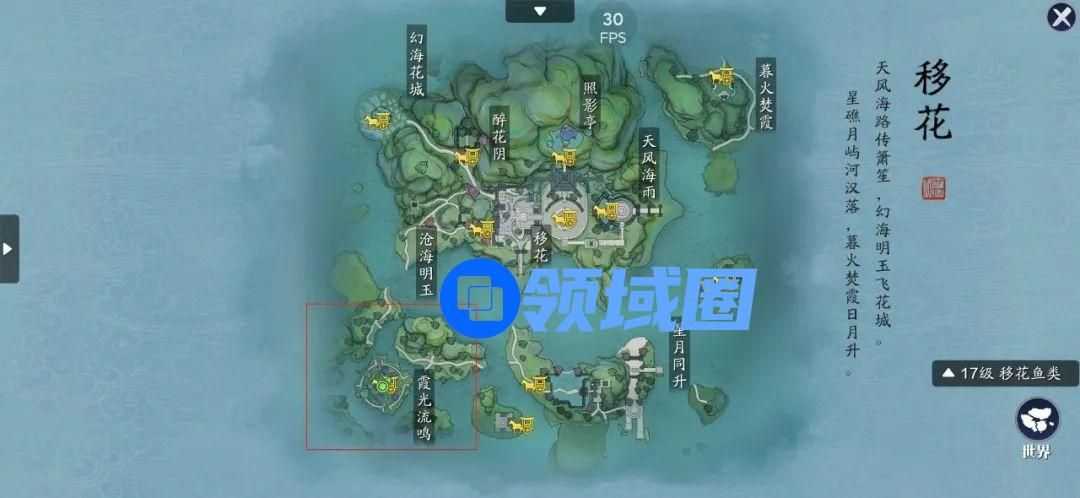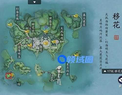 这个传音蛊的位置,就是在移花的左下角,就是霞光流鸣这个地方,玩家可以来到红框这个区域。