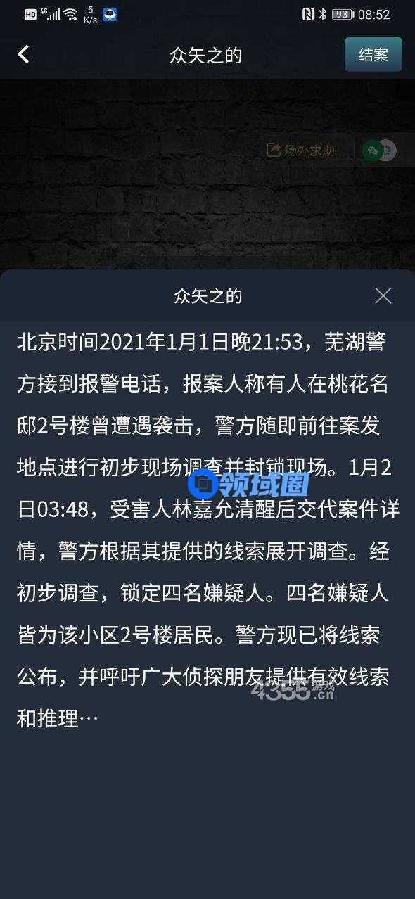 北京时间2021年1月1日晚21:53,芜湖警方接到报警电话,报案人称有人在桃花名邸2号楼曾遭遇袭击,警方随即前往案发地点进行初步现场调查并封锁现场。1月2日03:48,受害人林嘉允清醒后交代案件详情,警方根据其提供的线索展开调查。经初步调查,锁定四名嫌疑人。四名嫌疑人皆为该小区2号楼居民。警方现已将线索公布,并呼吁广大侦探朋友提供有效线索和推理…
