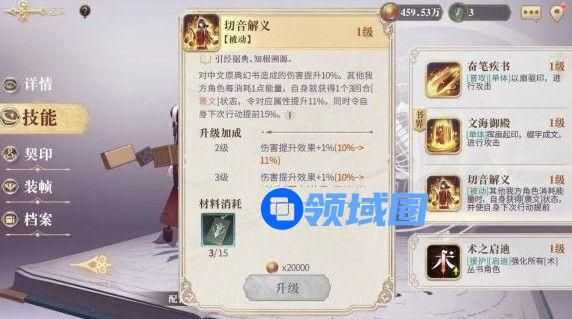 对中文原典幻书造成的伤害提升10%。其他我方角色每消耗1点能量,自身就获得1个3回合[褒文]状态,令对应属性提升11%,同时令自身下次行动提前159%。