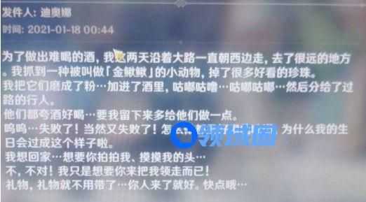 今天其实是迪奥娜的生日,在今天,也就是1月18日,玩家会收到来自迪奥娜的生日喜悦分享,不过该信件仅有提醒作用,没有详细的任务要求。