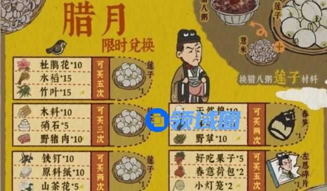 使用【莲子*1】和【薏米*1】即可兑换【腊八粥*1】,可换10次;