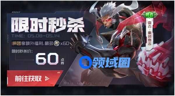 【限时秒杀,盘古重装意志】活动开启,60点券即可购买盘古-重装意志皮肤并发起拼团,拼团享额外福利,2人即可成团,拼团人数达5人全员可得60荣耀积分。
