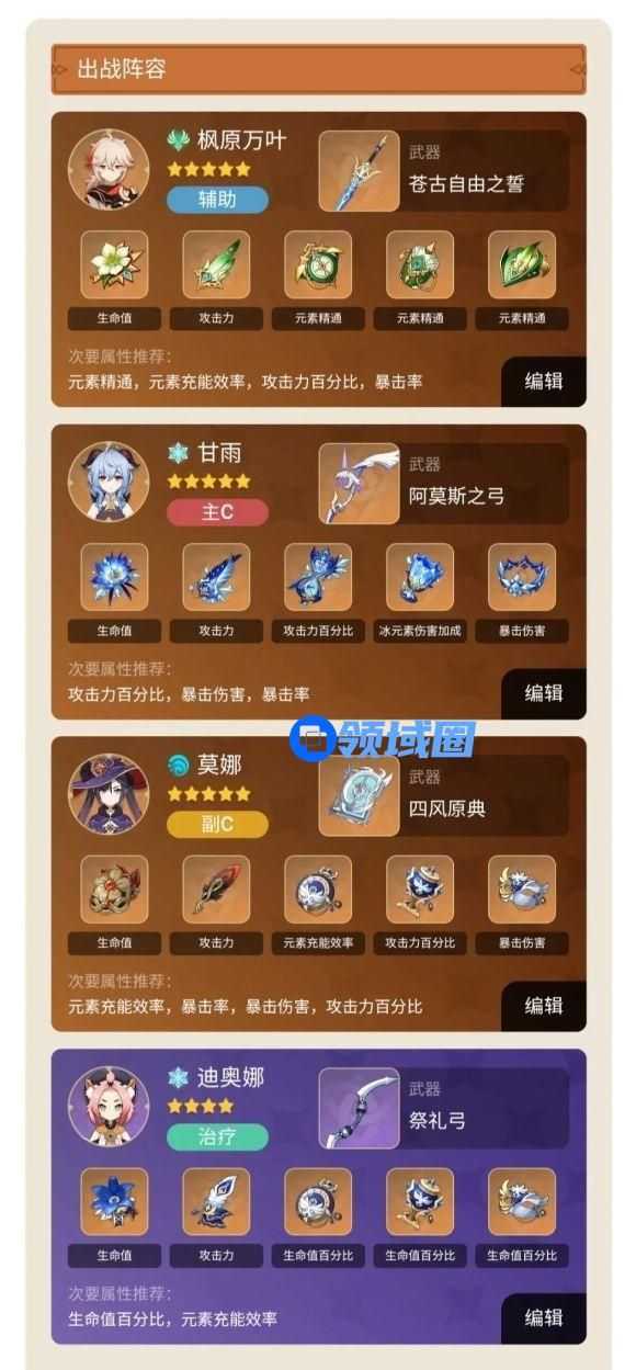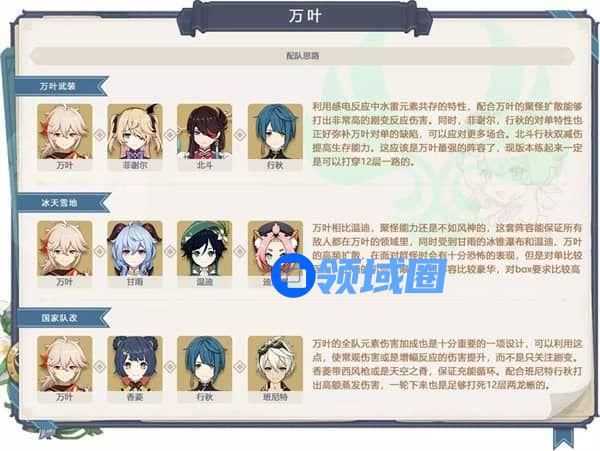 上文我们提到过万叶的一大优势——固有天赋2可以同时加成多种元素伤害,因此将万叶融入武装队是一个不错的选择。