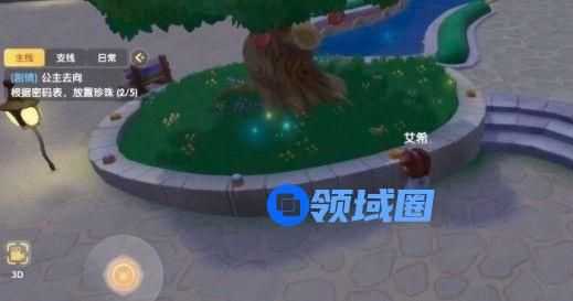 2、根据对话的内容需要找到公主的去向,来到如下图所示的爱心喷泉位置,可以看到一个光亮的图标以及密码表线索。