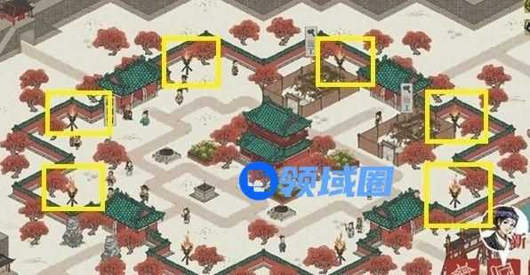 六个火把都放置在大门两旁,具体位置如图所示,黄色方框内为火把。
