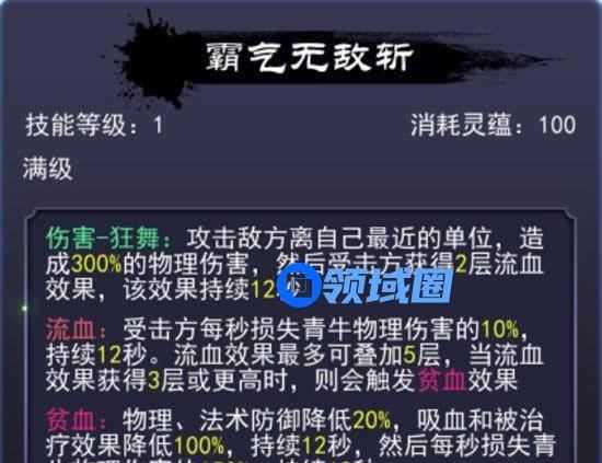 霸气无敌斩:攻击敌方离自己最近的单位,造成物理伤害,然后受击方获得2层流血效果。