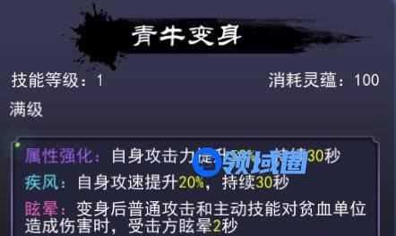 青牛变身:变身后提升自身攻击力、攻速,普通攻击和主动技能对贫血单位造成伤害时,受击方眩晕。