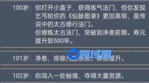 之后如果达到100岁即可触发事件,玩家获取仙脉图录,开启更加强大的修仙之旅。