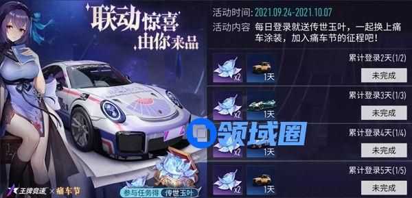 活动2:累登领玉叶。活动期间,每天登录即可领取2片传世玉叶和1天的痛车涂装试用。传世玉叶会自动打开,很大几率获得真理之钥,排位保护卡,痛车节车贴等惊喜好礼,你肯定不想错过,记得每天上线领取喔!