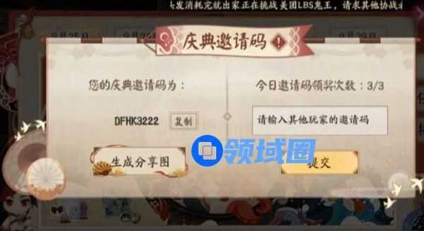 2、同时也可以将自己的庆典邀请码分享出去,让其他玩家可以填写你的五周年庆典邀请码。