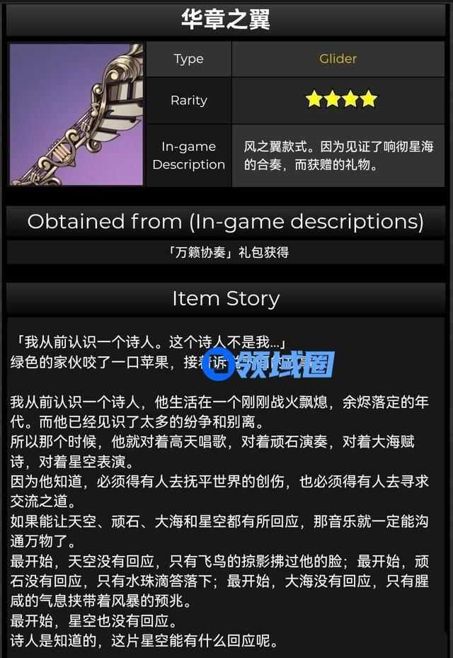 「我在想,如果有一天我能感动星海。那应该换来一场流星雨吧。啊,对了。这件风之翼就是星海的回应,是天上掉下来的,和你一样。」(旅行者突然露面。当然,这就是诗人和旅行者在闲聊星汉灿烂之翼的来历,伏线回收。)