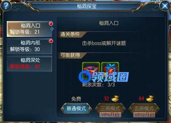 获取宝石,每一关的层次,每天都能够挑战3次,模式分别是普通模式,三倍模式和五倍模式,三倍模式需要vip6开启。五倍模式需要vip12开启。这种副本基本上挂机就可以了。