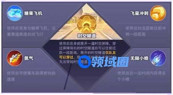车手们每次穿过充电站时,除了获得糖果飞机、飞星冲刺、氮气、无限小喷外,还有一定概率获得带有特殊标记的道具。如果获得带有特殊标记的道具可要注意了,这个道具如果传递给队友,自己可以额外获得一个超级技能——时空隧道。