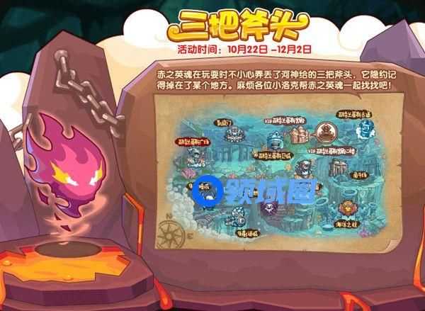 赤之英魂在玩耍时不小心弄丢了河神给的三把斧头,它隐约记得掉在了某个地方。麻烦各位小洛克帮赤之英魂一起找找吧!