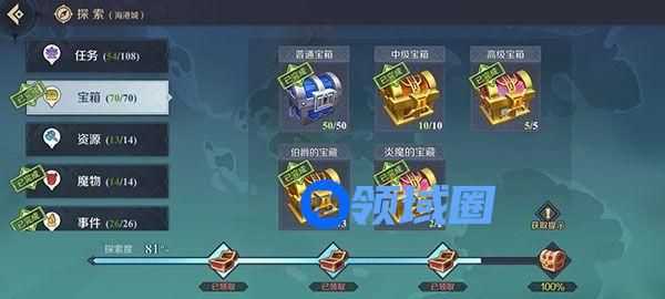 高级宝箱一共有7个:解密3个、精英怪4个、探索度需要5个。