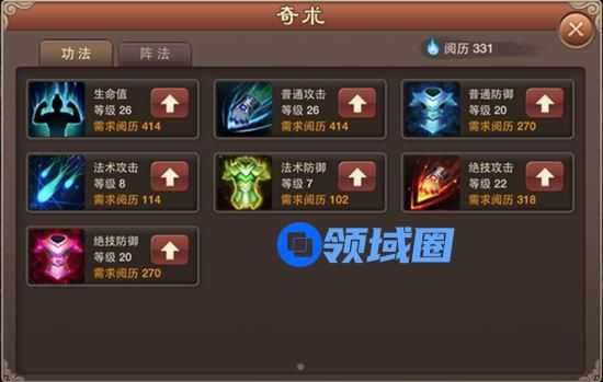 奇术系统在游戏前期可为仙友们提供大量属性的增益,并且是全部上阵角色的增益。因此阅历在前期将重点使用在奇术中。