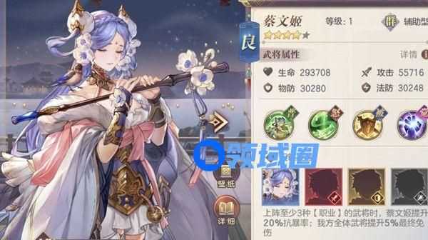 治疗我方全体,治疗量为蔡文姬30%攻击力,并提升我方攻击最高的单位15%攻击力,效果持续2回合,最多叠加2次