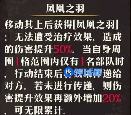 地上有一团火,踩到的人可以获得【凤凰之羽】,自身禁疗且增加伤害,周围四格只有一个敌人时就可以传给敌人,需要把这个传给BOSS来禁疗,就不怕BOSS回血了。