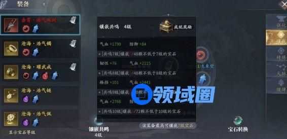 宝石镶嵌最需要注意的技巧,就是激活宝石的镶嵌共鸣属性。如图所示,当玩家身上的宝石达到共鸣要求时,能够激活镶嵌共鸣,给玩家带来大幅度的属性加成。因此不要盯着一颗宝石强化,结合自己的装备实力进行提升即可。