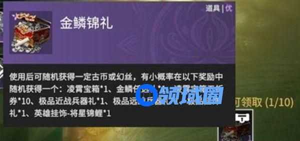 金鳞锦礼:使用后可随机获得一定古币或幻丝,有小概率在以下奖励中随机获得一个:凌霄宝箱*1、金鳞任选礼*1、凌霄宝箱五折券*10、极品近战兵器礼*1、极品远战兵器礼*1、极品挂饰礼*1、英雄挂饰-将星锦鲤*1