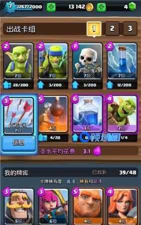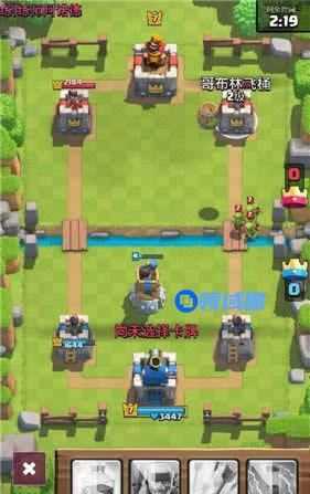 hide也就是瞄准圈框住整个公主塔,丢下去后,哥布林会呈三角形散开,对面如果没有类似于箭雨的Aoe那就很头疼了